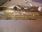 We recently conserved a late 18th c. carved and gilded European picture frame for a painting by Gilbert Stuart of Maj. Gen. Charles Rainsford. Our challenge was to conserve this frame rather than restore it. Conserving it made the necessary repairs while maintaining as much of the original gold work intact as possible. We had to consolidate the gesso which had extensive craquelure and would continue disintegrating if left untended. We recarved many outer elements which were broken and missing. Matching the gold to the original was a challenge as gold color changes in the light. I had to move the frame around the studio several times at different times of day under different lighting conditions until I was satisfied with the color of gold leaf to match the original.