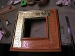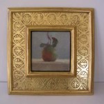 This body of work (the still lifes) we framed in a canvas floater frame using burnished 22 karat gold leaf on the face of the frame and painting the sides a color we worked on with the artist to harmonize with the mid-tones in the painting. One individual painting, a still life of a pear, was framed in a very special frame we created and which we refer to as the Persian frame. It’s carved panel is based on an incised pattern we saw on an antique Persian censer. I was excited about building this frame for her pear painting because she wanted to turn the painting into a gem by placing it into this special frame—and she remembered Robert Kulicke and his miniature still lifes of fruit which he would then surround in hand made tabernacle frames to transform the humble fruit into something to be worshipped.
