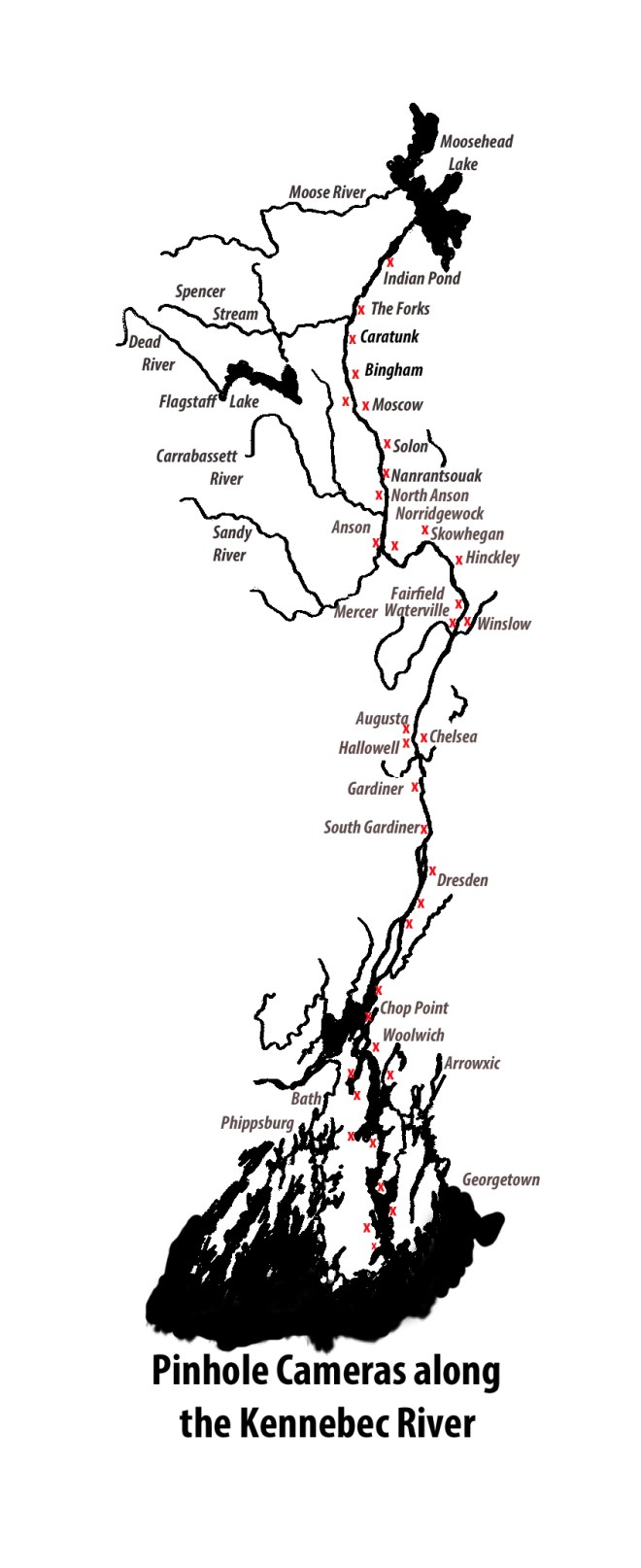 Today marks a turning point in the project. We went out and collected about 14 pinhole cameras along the Kennebec River. There are now about 12 more to collect. Once those are processed, we will be able to edit the best images down to about 30 solargraphs for the exhibit at the Maine Museum of Photographic Arts for January 2014. I’m excited that my show and the show at UNE will be the first two for the Maine Photo Project for 2015. I spent most of today creating a map of the river and marking where the pinhole cameras were set for the project. 120 pinhole cameras along 230 miles is one nearly every two miles. It’s been a great journey so far, and the fun has only just started! I’m excited about where this project has taken me and where it will take me into 2015! Here’s a great link for you to peruse if you are interested in Kennebec River facts: Maine Rivers