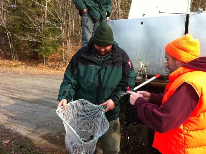 During hunting season we find it safer not to hike in the woods out back, so often in November we do our hiking on the trails of a local preserve or Wildlife Management Area. We hit Jamie Pond WMA in Manchester today and had the pleasure of watching one of the last I F & W trout stockings of the season. Jamie Pond provides water for the Hallowell Water District; there is a remnant of an old mill on the land, and it’s one of the feeder ponds to Cobbosseecontee Stream which empties into the Kennebec River in Gardiner. The I F & W crew were stocking three bodies of water with trout today as the last of the rounds of the season. The Kennebec River got stocked with over 13,000 brown & brook trout this year. This fishery management program attempts to keep a population balanced so that the stocks can be sustainable. One of the major threats to native fisheries is the illegal stocking of non native species by individuals seeking to have a body of water where they can catch their favorite sport fish. For example, a dude from away wants to catch the same game fish he’s used to fishing for at home in Michigan when he’s visiting his family camp in Maine. So he brings in a cooler filled with his selfish desires and dumps it into the pond in front of the camp. Illegal introduction of Black crappie, small and largemouth Bass, Chain Pickerel, and Northern Pike have decimated native fish stock. The Kennebec River drainage system coming from the Belgrade Chain of Lakes has had its premier stock of native landlocked salmon destroyed by the illegal introduction of Northern Pike.